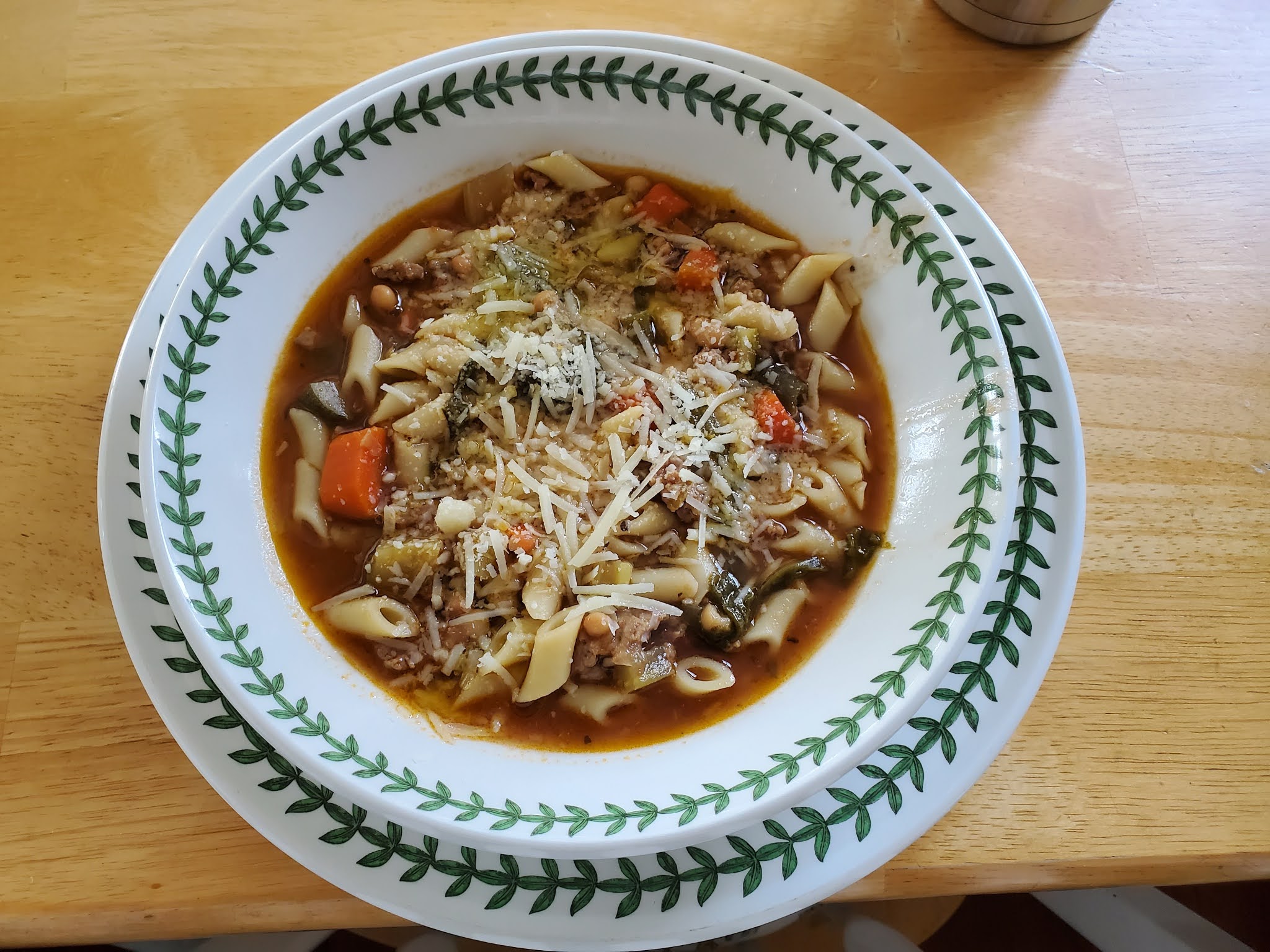 In Italy, minestrone really is a vegetable soup, that may have a few leftover beef or pork bones thrown in for flavor, but they hardly ever use stock to enrich the broth, rather they will use Parmigiano rinds, fruity olive oil to begin the soup, and fresh veg to flavor the soup. I threw all that out the window yesterday, I started with sweet Italian sausage, added wine, and tomatoes, and both beef and chicken broth because I wanted a really hearty soup. So, here goes.